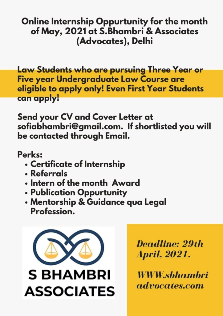 S.Bhambri & Associates are calling all the interested Law students and Law aspirants alike for their Online Internship Programme for the month of May, 2021. Even first year students can apply.